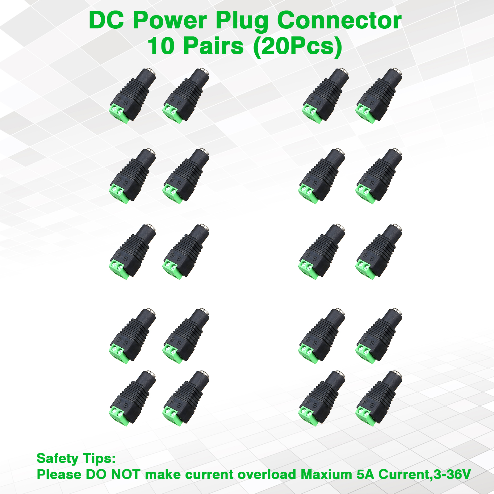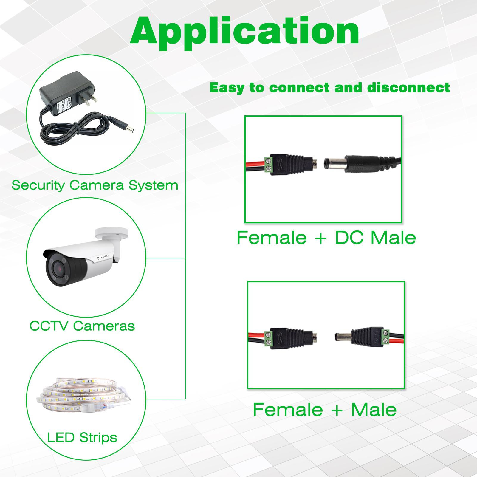 APPLICATION: for 5V 12V 24V 36V 48V DC Power Supply, such as CCTV Connector, Security Tailgate Camera, Led Light Strip Extension, Video Balun, DIY Board, Stereo Barrel, Electrical Project, Projector Link etc.
