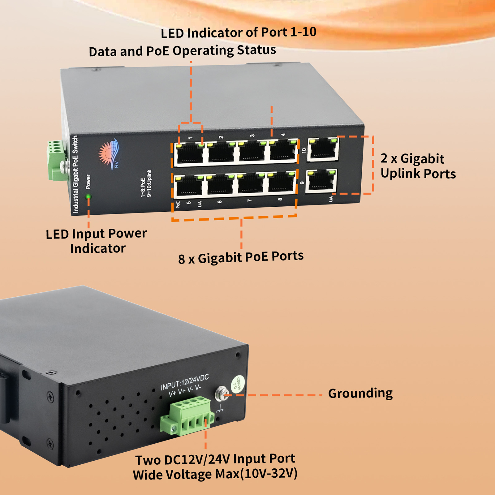 | Port Configuration | PoE Port: 8 10/100/1000Mbps RJ45 Uplink Port :2 10/100/1000Mbps RJ45 LED indicator lamp : Power, PoE, L/A, LED. |