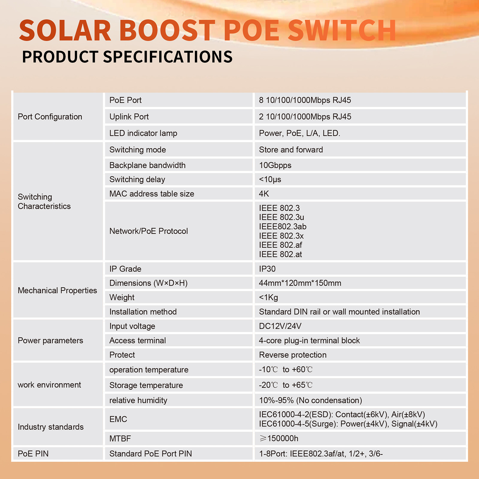 | Switching Characteristics | Switching mode :Store and forward Backplane bandwidth :10Gbpps Switching delay :<10μs MAC address table size :4K Network/PoE Protocol:IEEE 802.3 IEEE 802.3u IEEE802.3ab IEEE 802.3x IEEE 802.af IEEE 802.at |