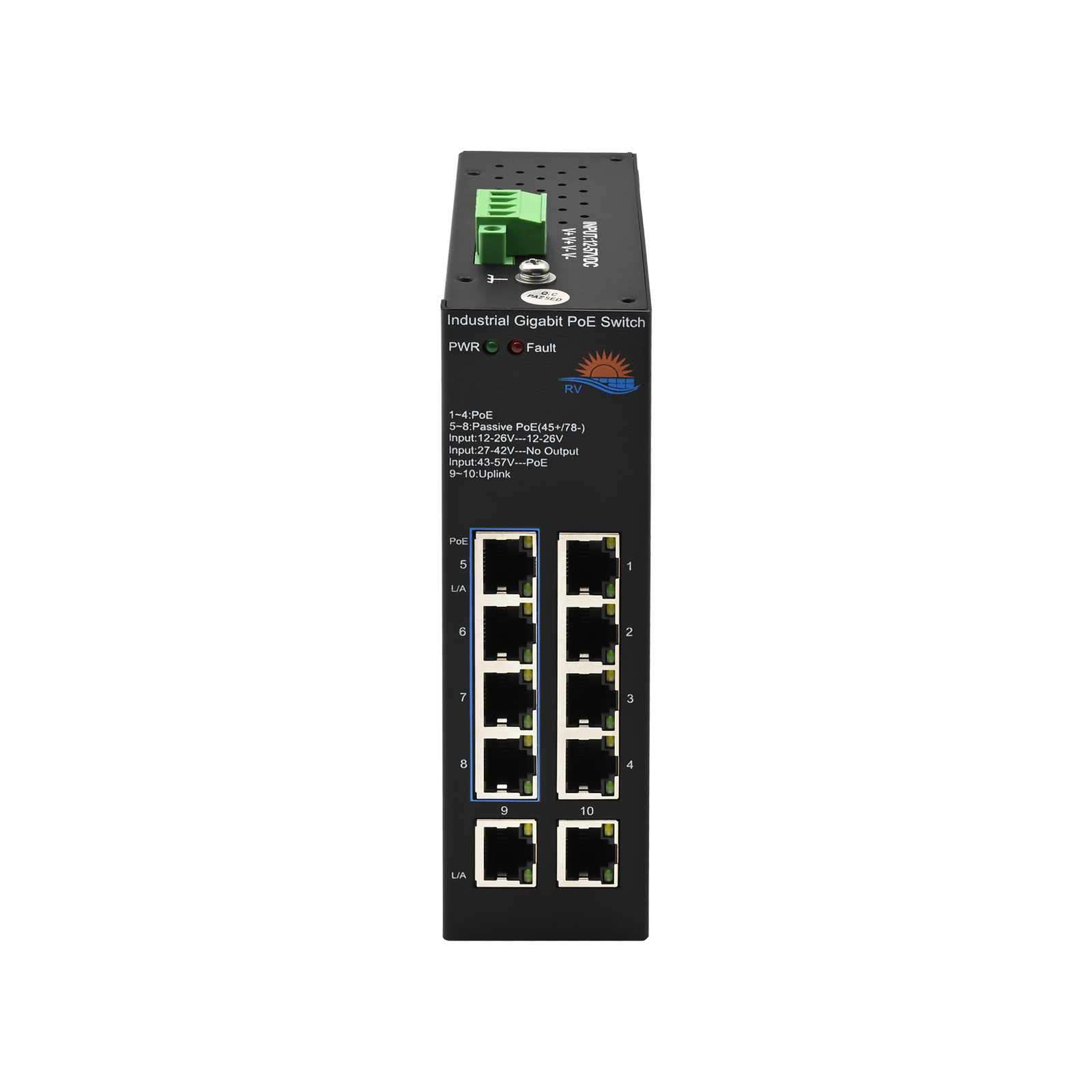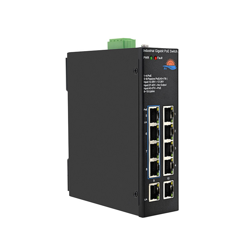 | Port Configuration | PoE Port: 8 10/100/1000Mbps RJ45 Port 4-port Standard PoE Output (IEEE802.3af/at) 4-port Passive PoE Output (12/24VDC) Uplink Port :2 10/100/1000Mbps RJ45 Port LED indicator lamp : Power, PoE, L/A, LED. |
