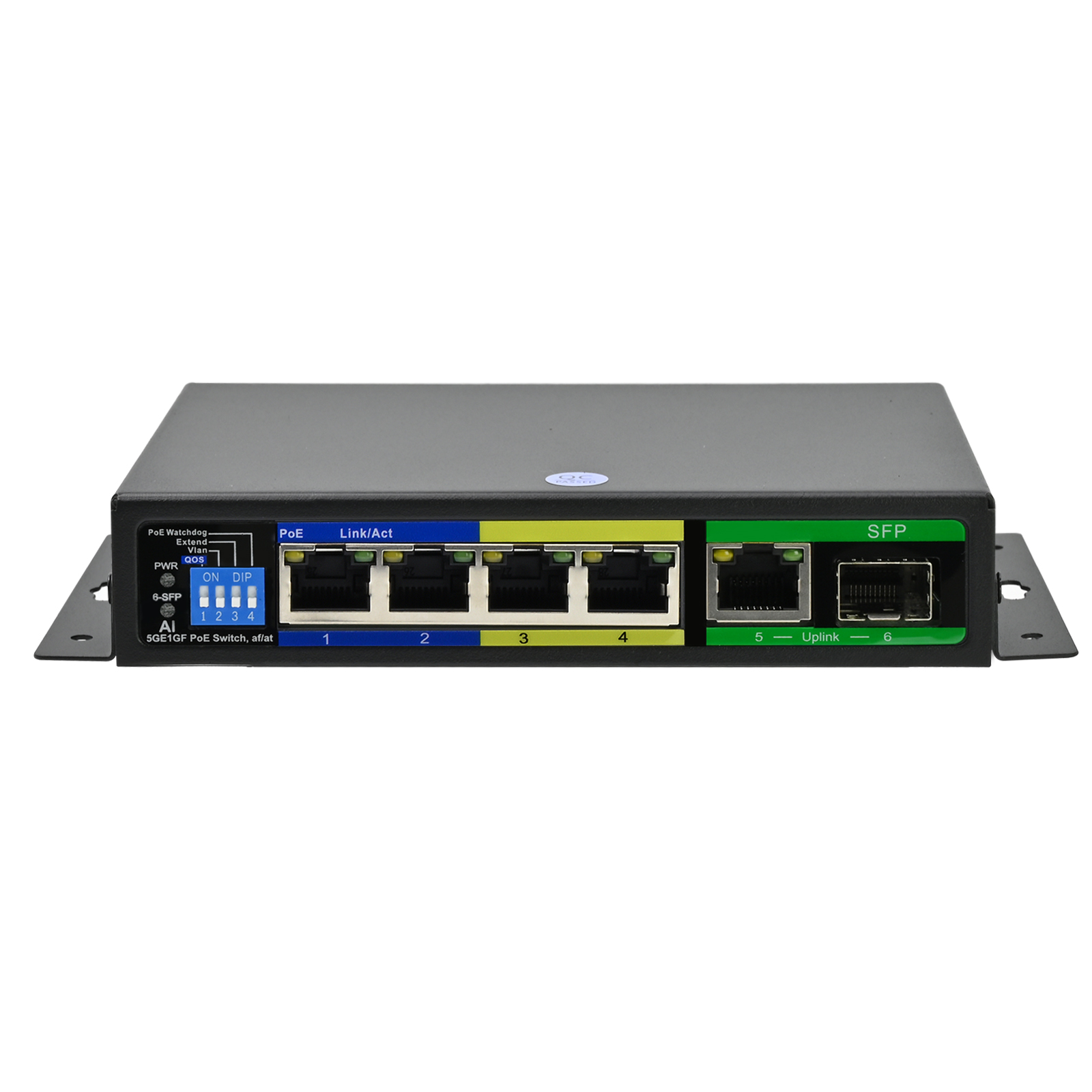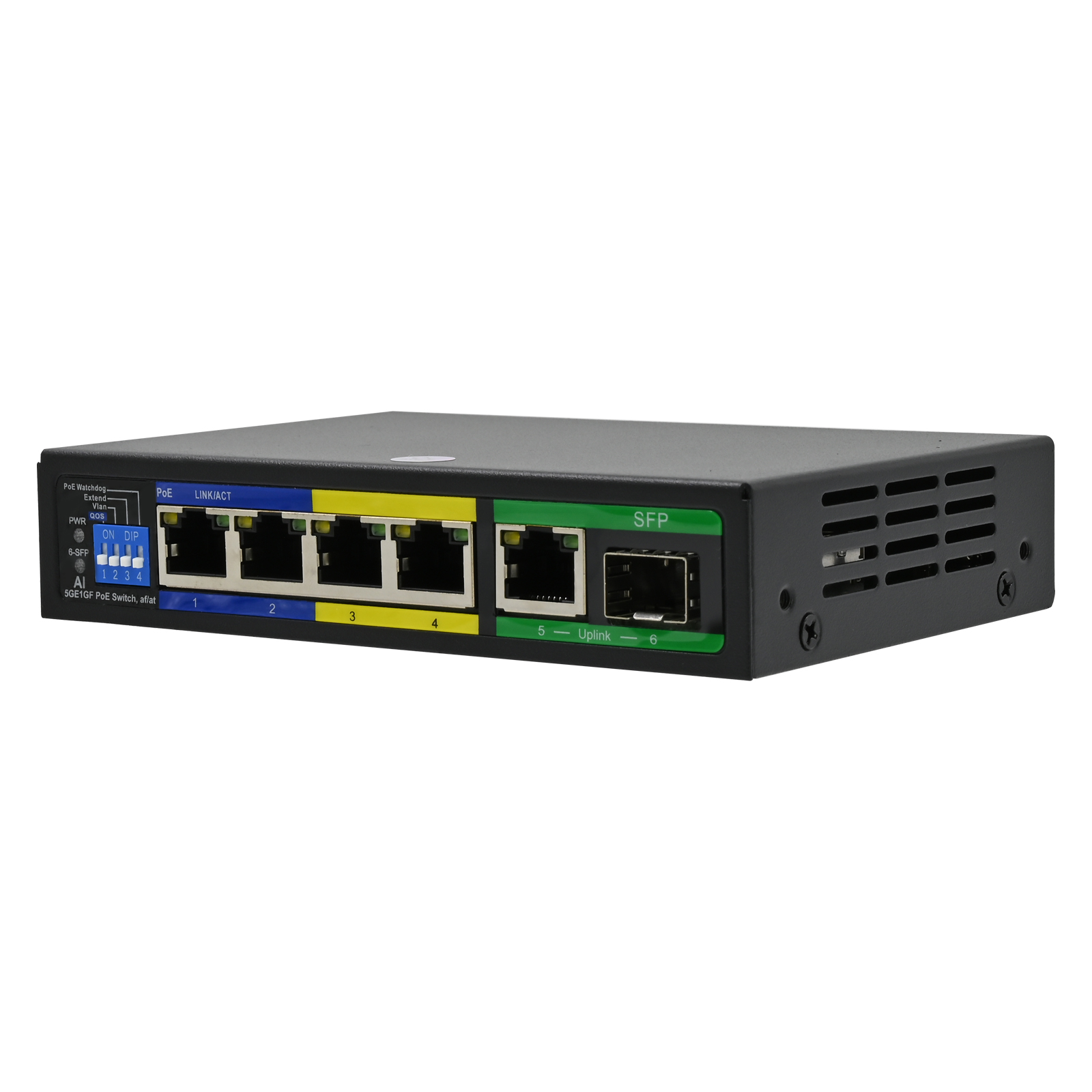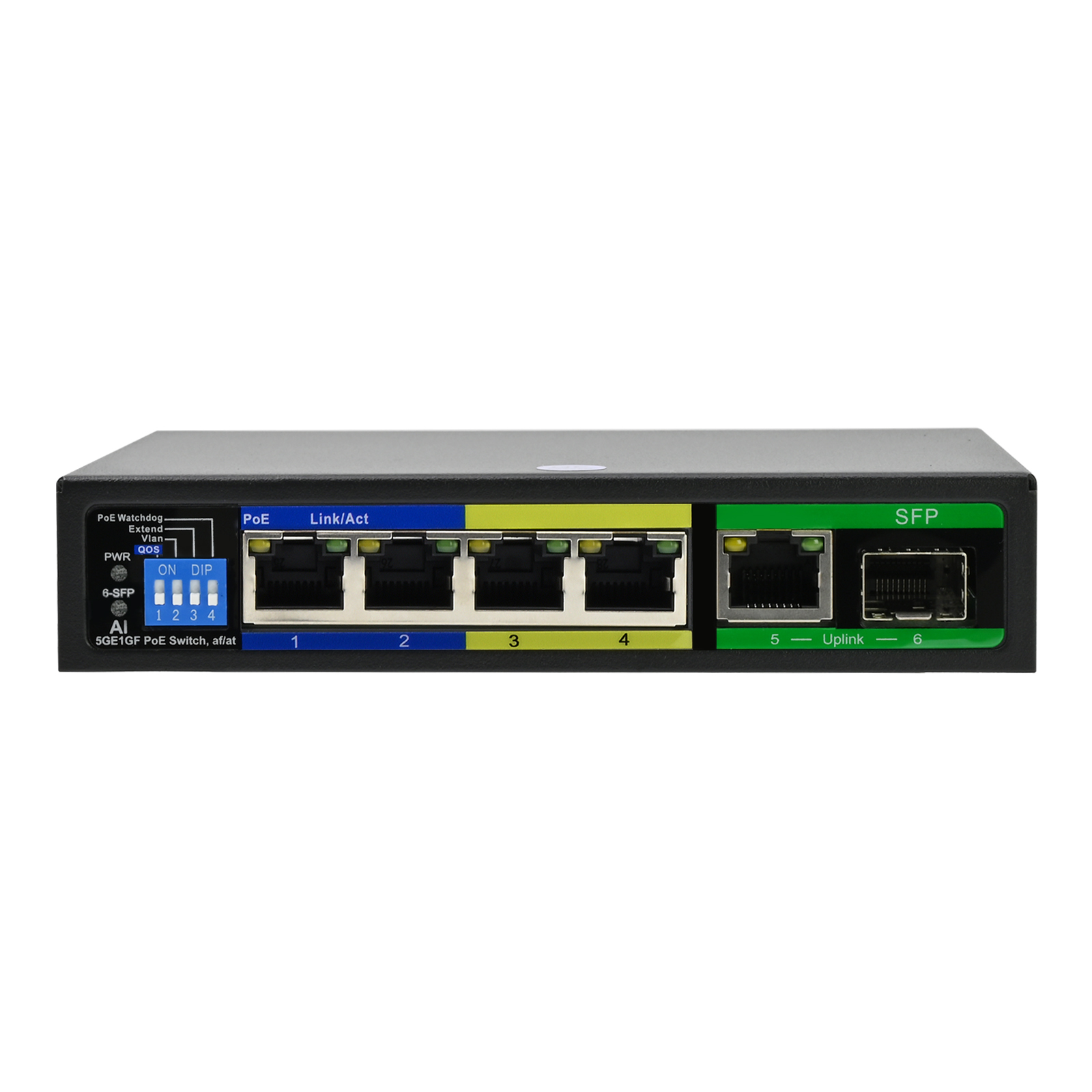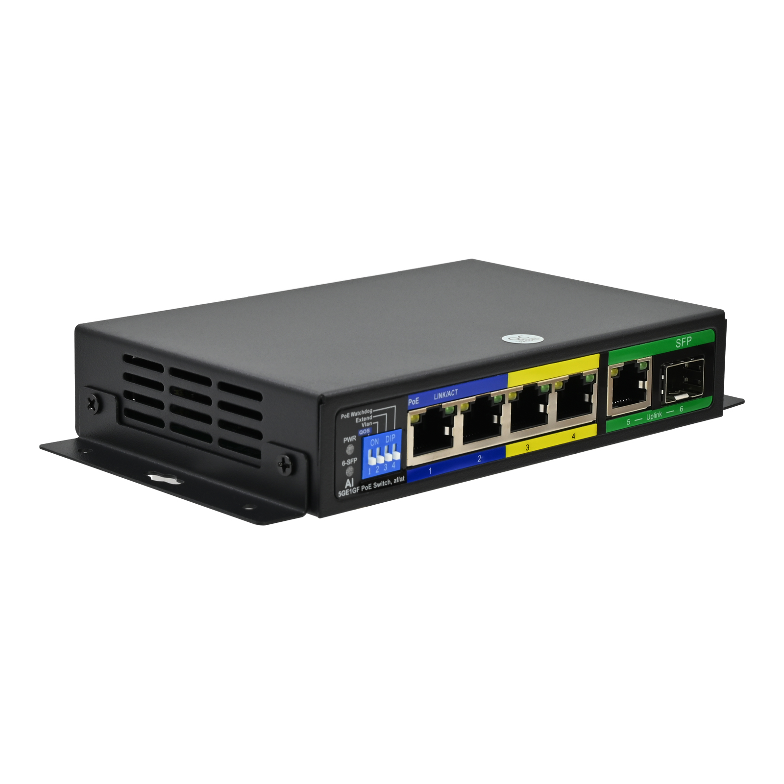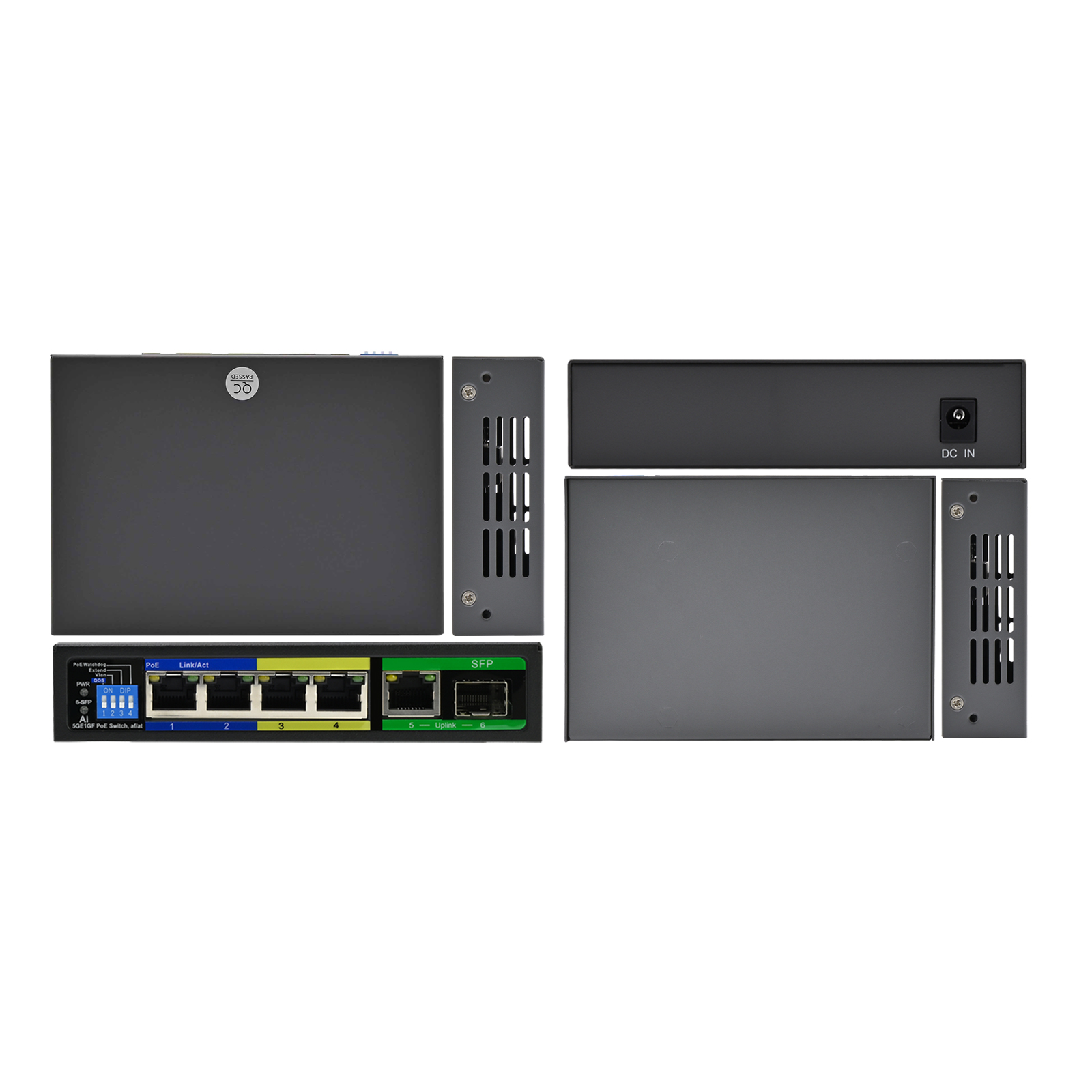 The 4 Ports Gigabit PoE Switch is fully integrated to support security monitoring, providinghigh-performance packet forwarding and Gigabit Ethernet transfer rates. Adaptive ports use the appropriate bandwidth to ensure clear images and smooth transmission for any application, including high definition video recording or streaming. The Al DlP switch enables PoE Watchdog, QOS, Extend and VLAN modes to further increase performance and